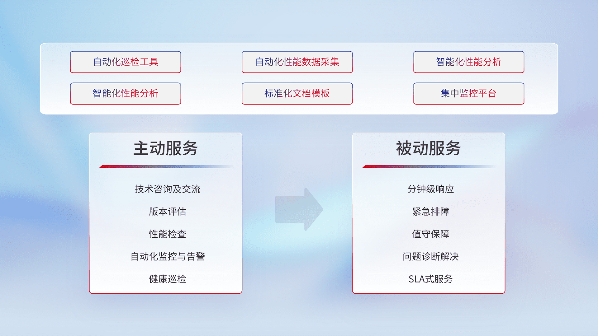 智能化工具和标准化文档,,,保障服务质量,,,,提供主动服务(包含技术咨询、、、、版本评估、、、性能检查、、自动化监控与告警、、健康巡检)和被动服务包含(分钟级响应、、紧急排障、、、值守保障、、、、问题诊断解决、、、、SLA服务)。。